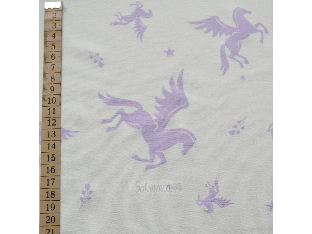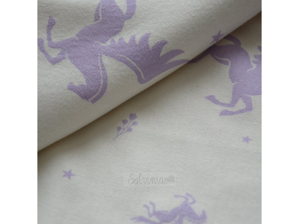 Silnější bio bavlněný úplet (oboulíc) v přírodní barvě s potiskem fialových Pegasů.