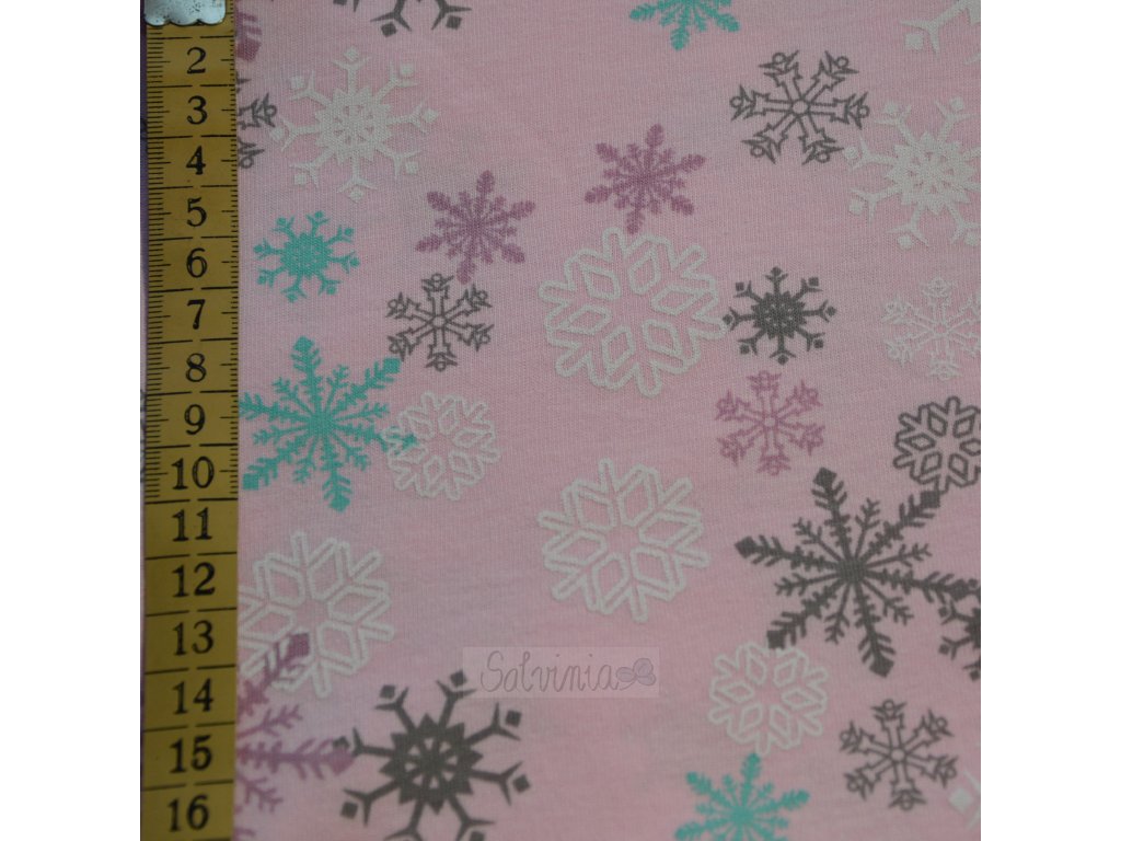 Tenčí bio bavlněný úplet (jednolíc) v růžové barvě se vzorem vloček, vhodný především na trička. Díky certifikátu Öko-Tex Standard 100 se hodí i pro naše nejmenší.